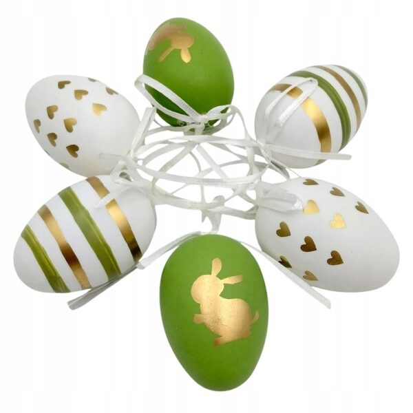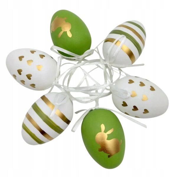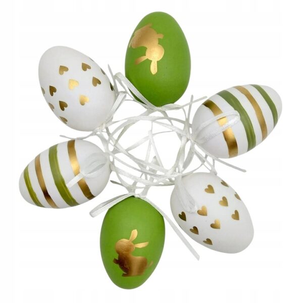 5. Jajka wielkanocne zielone białe złote 6 sztuk pisanki styropianowe zawieszki 6 cm