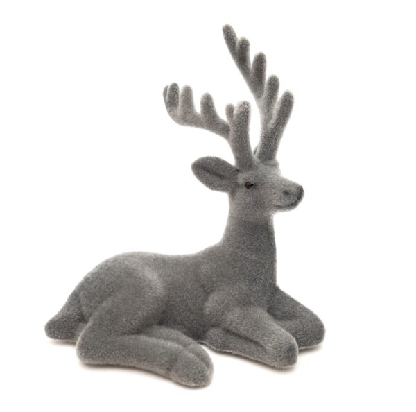 4. Renifer leżący szary flokowany jelonek dekoracyjny 15 cm